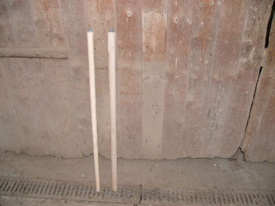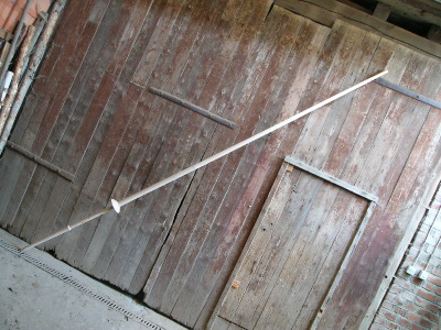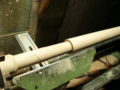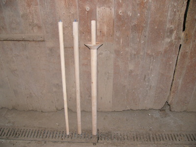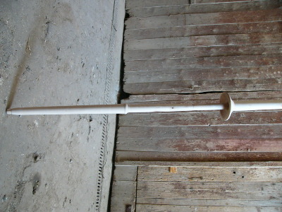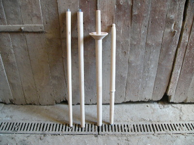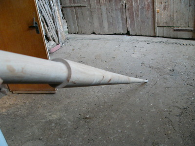 Da die Lanzen gleichmäßig konisch sein sollten und am Ende aus vier Teilen zusammengestzt werden müssen, sollte eine gleichmäßige "Steigung" beibehalten werden. Wenn die Spitze einen Durchmesser von ca 2,5 cm haben soll, und der Gesamte Lanzendurchmesser nicht mehr als 5 cm betragen sollte, muß das ganze dementspechend auch auf die Länge eingeteilt werden, damit zum Schluss das Gesamtbild passt. Der Anfangsdurchmesser eines jeden nächsten Teiles sollte natürlich dem Enddurchmesser des vorangegangenen entsprechen.