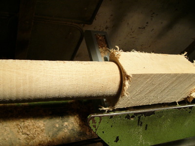 Anfangs geht es daran, aus abgelagerten Buchenstamm- vierteln rissfreie Stücke zu suchen um sie auf der Kreißsäge auf die entsprechenden Maße zu bringen.