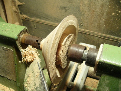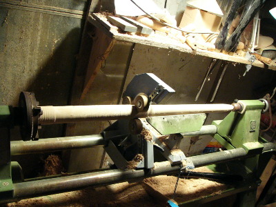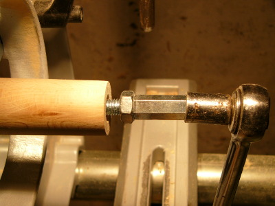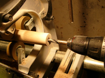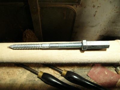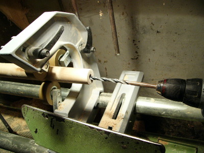 Zusammenfügen der Einzelteile! Erst mal Gedanken über das "Wie" machen. Gewindestäbe waren erschienen mir als zu labil. ( verbiegen sich leicht ) Also entschied ich mich für 15cm lange Stockschrauben in Verbindung mit entsprechenden Gewindemuffen. In jedem Fall müssen entsprechende Bohrungen in das Längsholz der einzelnen Teile absolut zentrisch erfolgen. ( Damit die Lanze im Gesamtbild nicht "krumm und bucklig" wird. Das ist nicht ganz einfach, wenn man das freihändig ausführen muss. Das Holz ist inhomogen und der Bohrer kann leicht verlaufen. Trotzdem hab ich es mit laufender Drechselbank und gleichzeitig sich drehendem Bohrer einigermaßen hinbekommen. Die Teile sollen ja anschließend aussehen, als wär es ein Teil. Ein Versatz von 0,5 Millimeter auf jeder Seite, ergibt im ungünstigsten Fall an der Übergangsstelle 1mm.